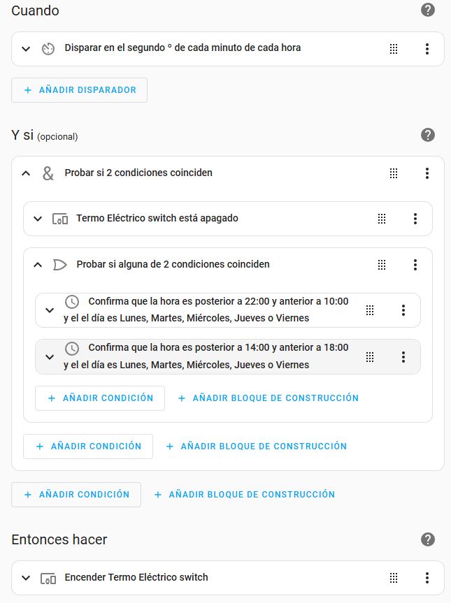 Esta programación tiene el inconveniente de que si en el momento de dejar de alimentar el termo eléctrico éste se encuentra calentando el agua, el termo permanecerá encendido durante todo el periodo punta. Esto se puede minimizar añadiendo dos bloques mas en las condiciones para que realice la comprobación, por ejemplo, a las 10:30 y a las 18:30 ya que, como he comprobado, el termo tarda en calentar el agua unos 20 minutos. Mala suerte sería si en esos momentos, por estar usando el agua caliente, también el termo estuviera calentando el agua.
